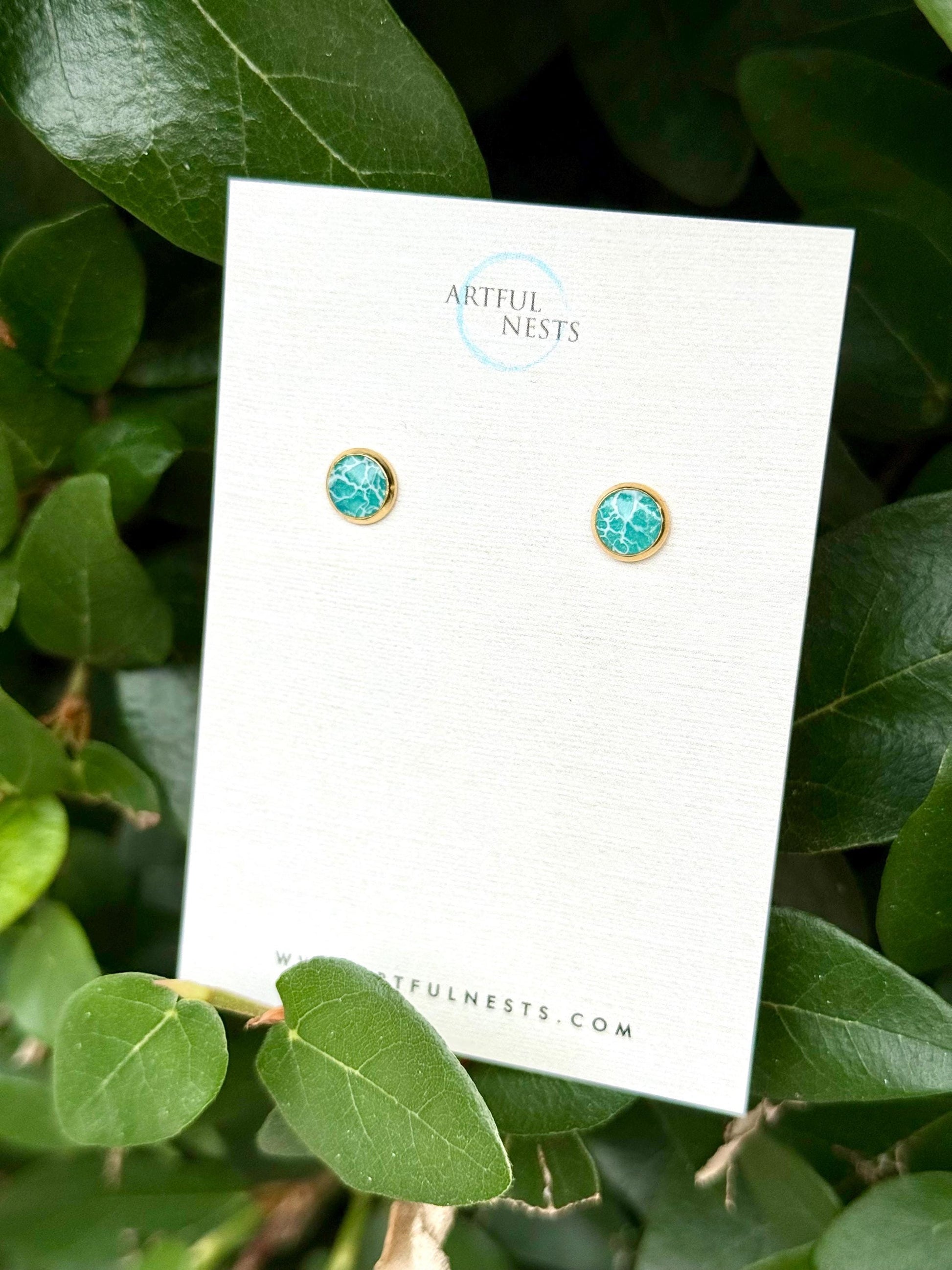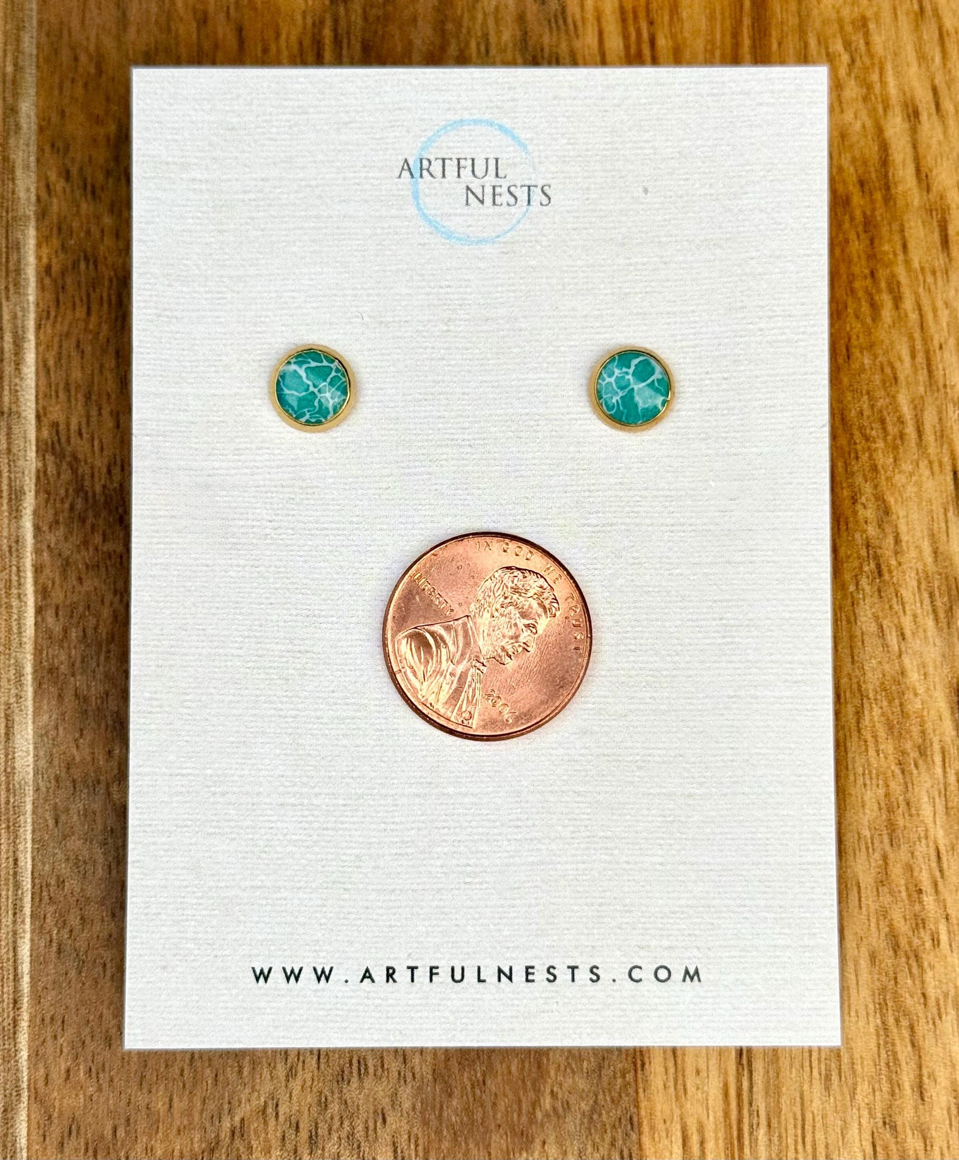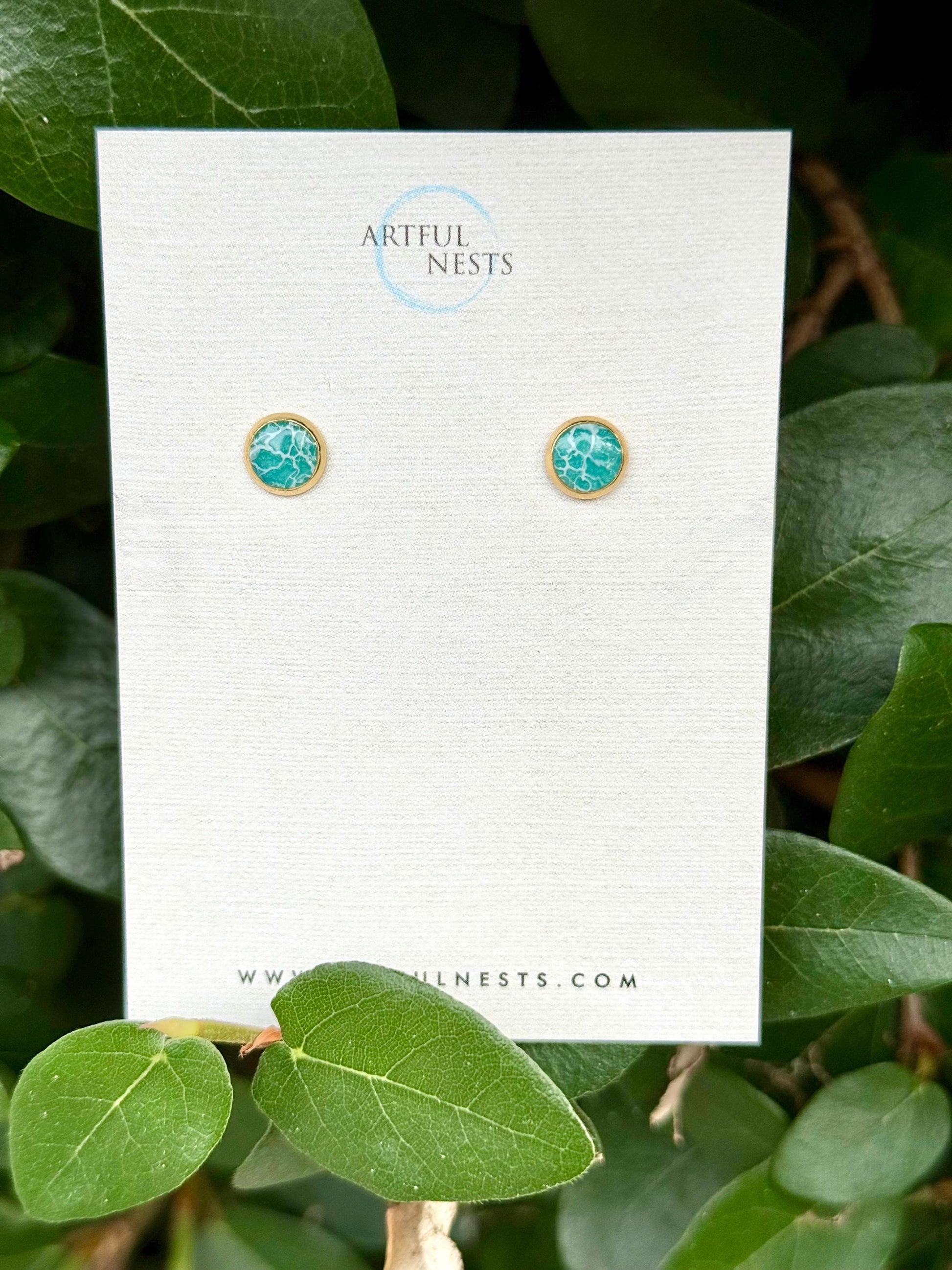 Elevate your style with these 8mm gold stainless steel stud earrings featuring glossy teal and blue resin waves. Each pair is handcrafted for a unique ocean-inspired look and made with hypoallergenic, tarnish-resistant materials—perfect for sensitive ears. A beautiful everyday accessory and a thoughtful gift for beach lovers or coastal jewelry fans.