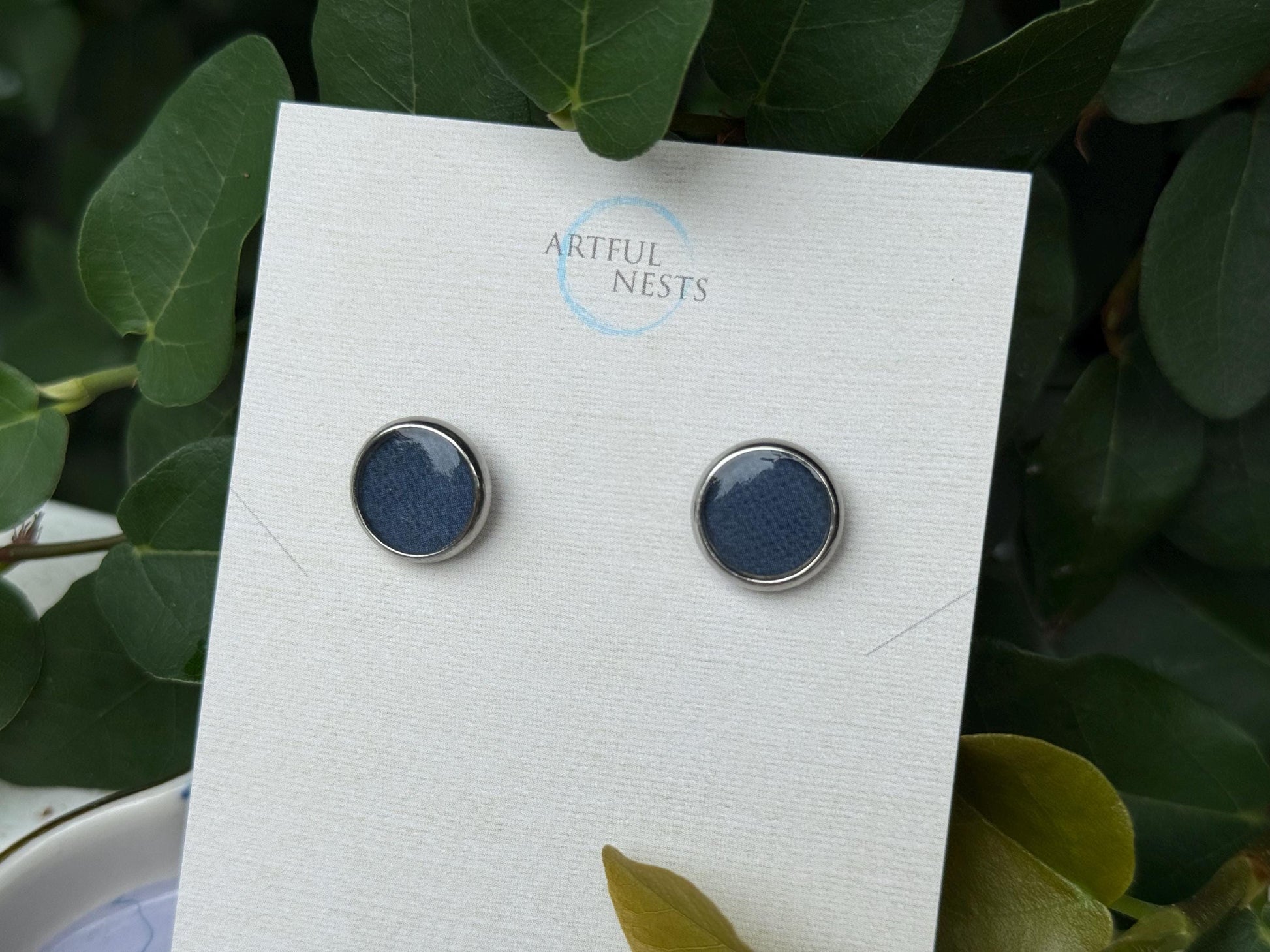 Lightweight and comfortable, these studs are ideal for daily wear or adding a subtle statement to any outfit. The navy blue pattern is sealed in crystal-clear resin for a smooth, durable finish.