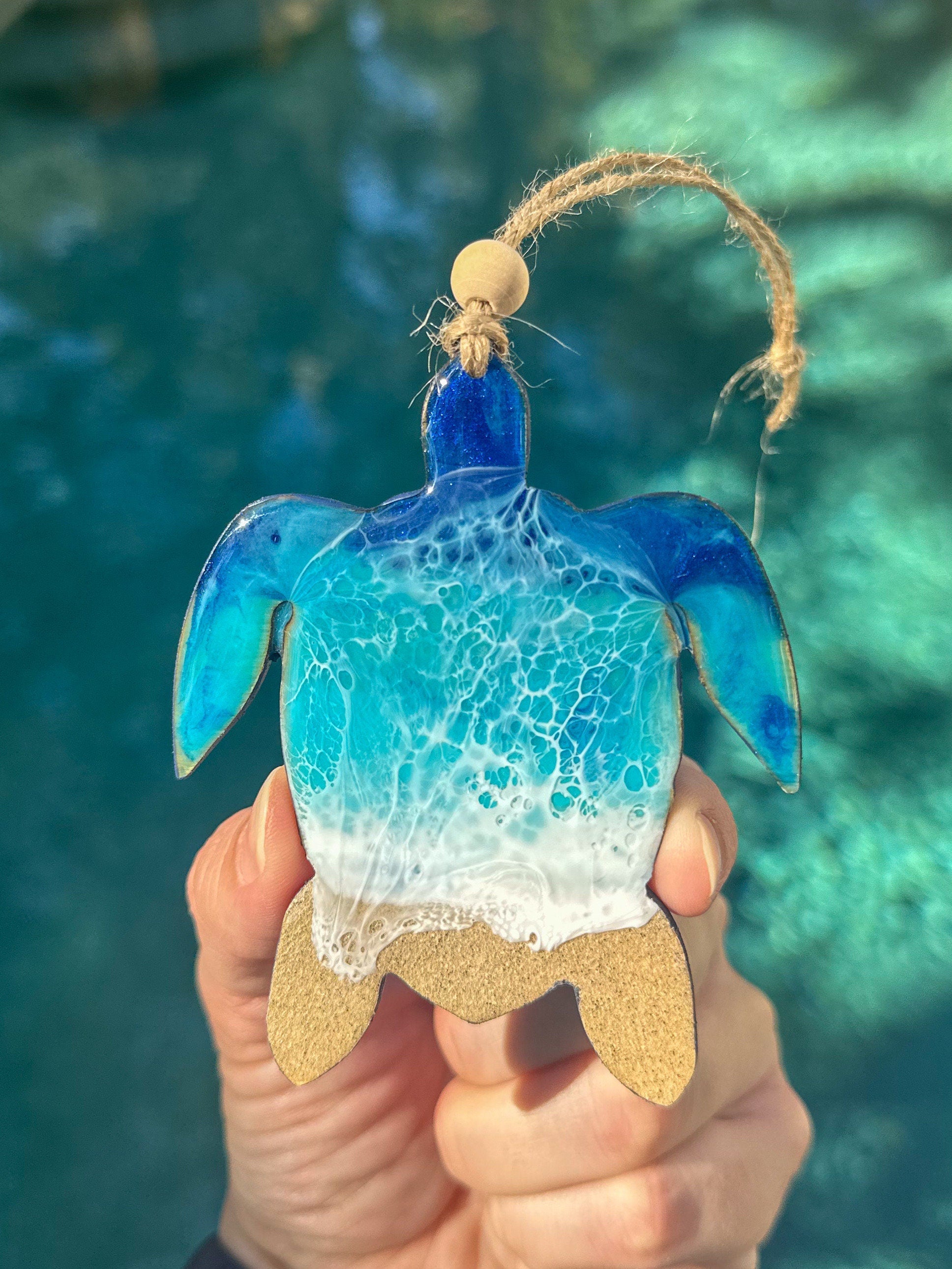 Celebrate love and nature with this beautifully handcrafted turtle ornament, designed to capture the serene beauty of the ocean. Each piece features layers of shimmering resin, carefully poured to mimic the movement of ocean waves, creating a tranquil, calming effect. Perfect for any sea lover, nature enthusiast, or someone special this Valentine’s Day!