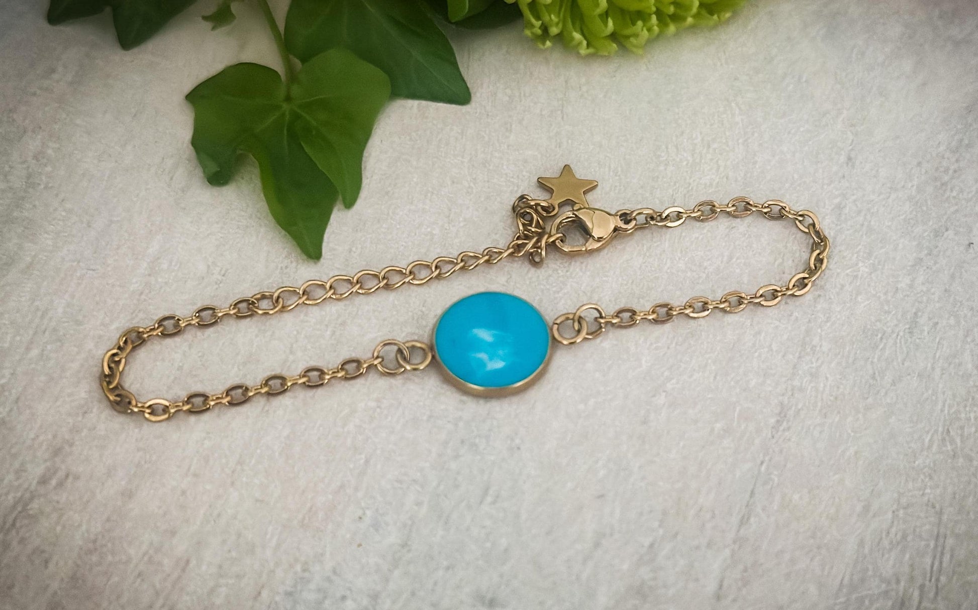 This stunning gold stainless steel chain bracelet is the perfect blend of elegance and style. Featuring a 12mm bezel filled with vibrant teal-colored resin, this bracelet makes a bold statement while offering a touch of sophistication.