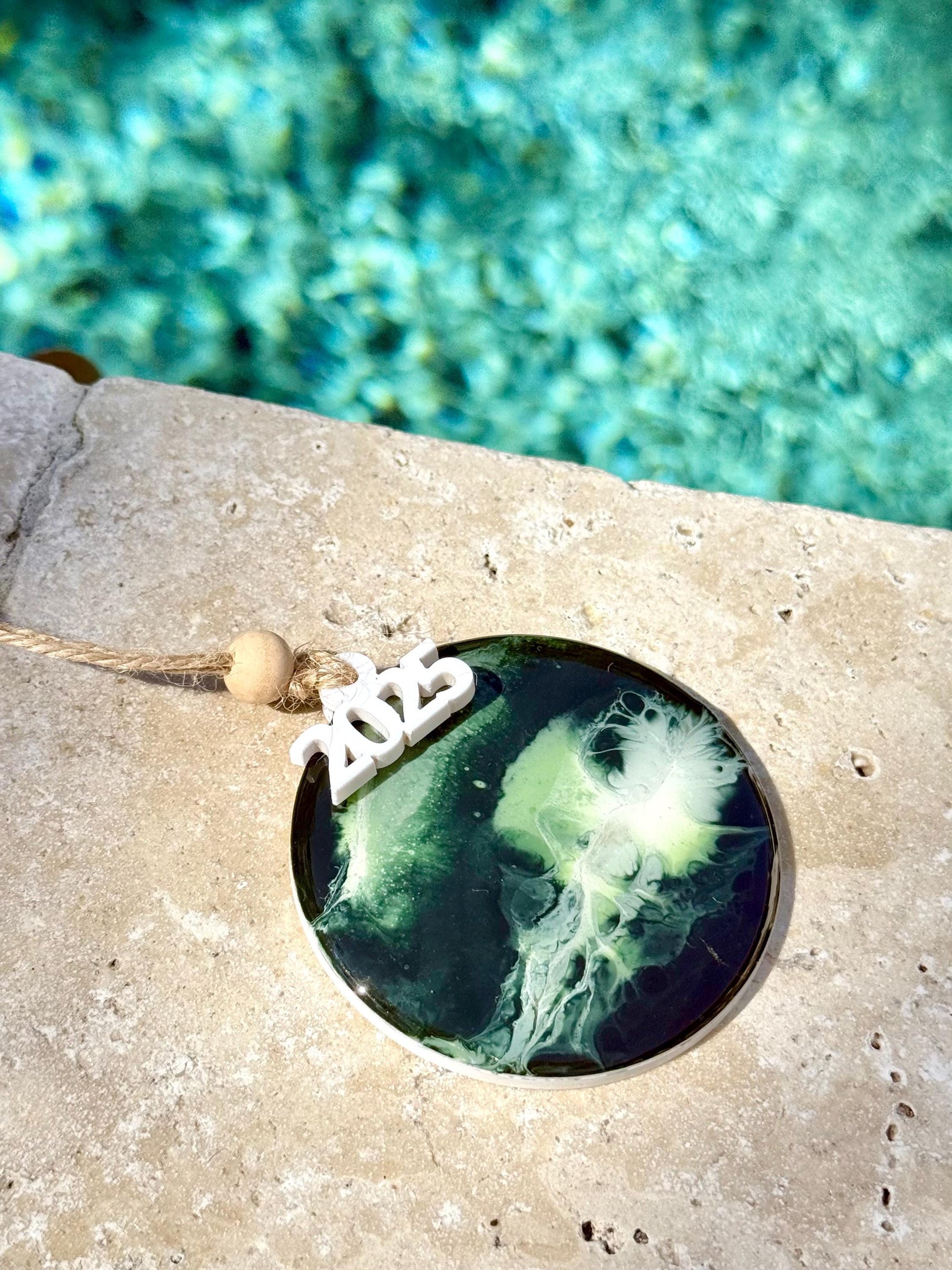 Ring in the new year with a custom, one-of-a-kind ornament that blends modern design and festive spirit! This beautifully crafted ornament features a 2.5-inch acrylic circle base, expertly layered with rich shades of green resin, creating a stunning depth and texture. At the heart of the design, a crisp white acrylic "2025" charm shines as a symbol of new beginnings, making this piece a perfect addition to your Christmas decor or a thoughtful gift for friends and family.