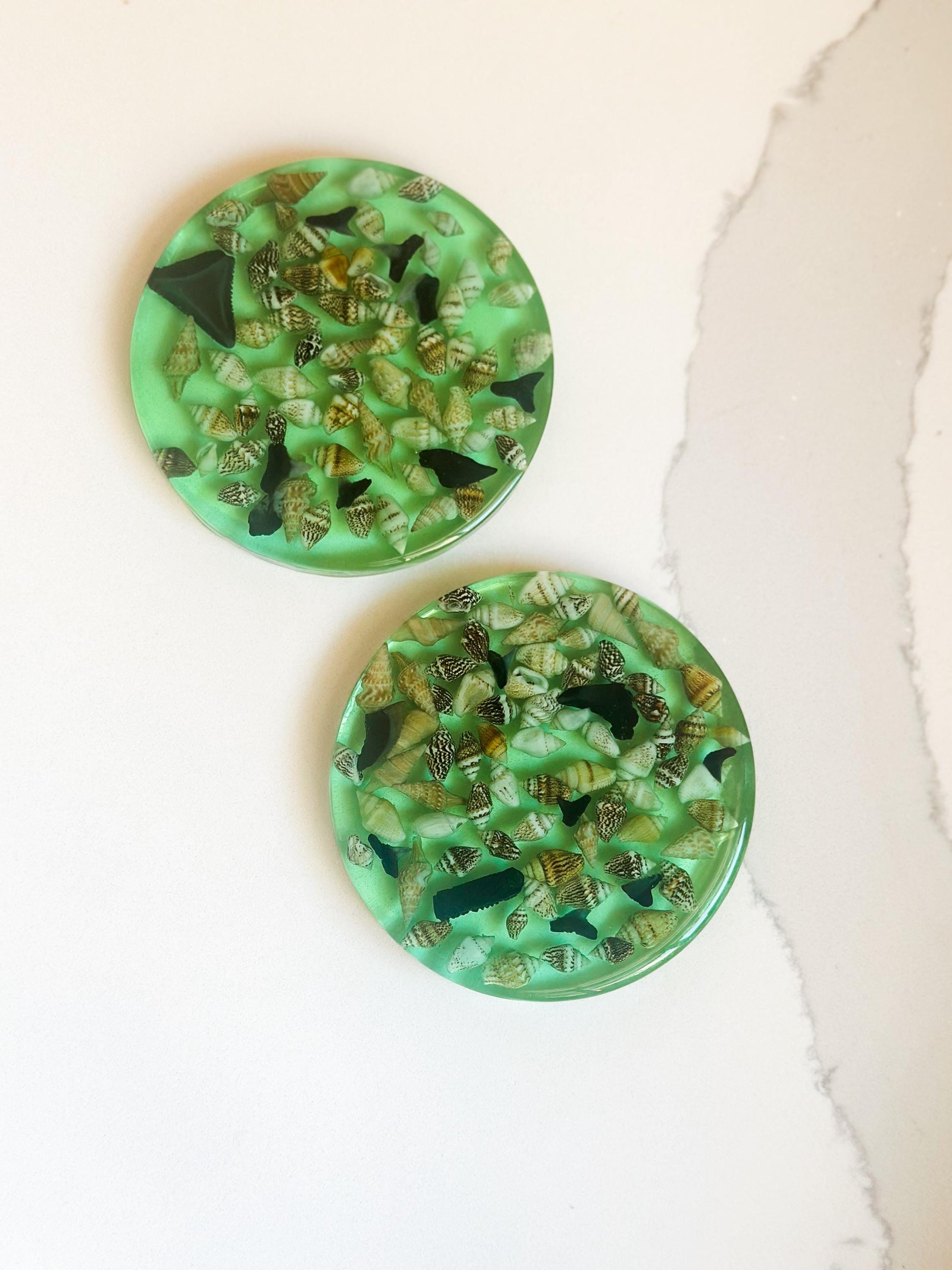 Resin Coaster Set of Two With Shells and Shark teeth- Beach House Decor