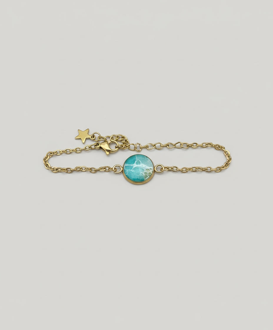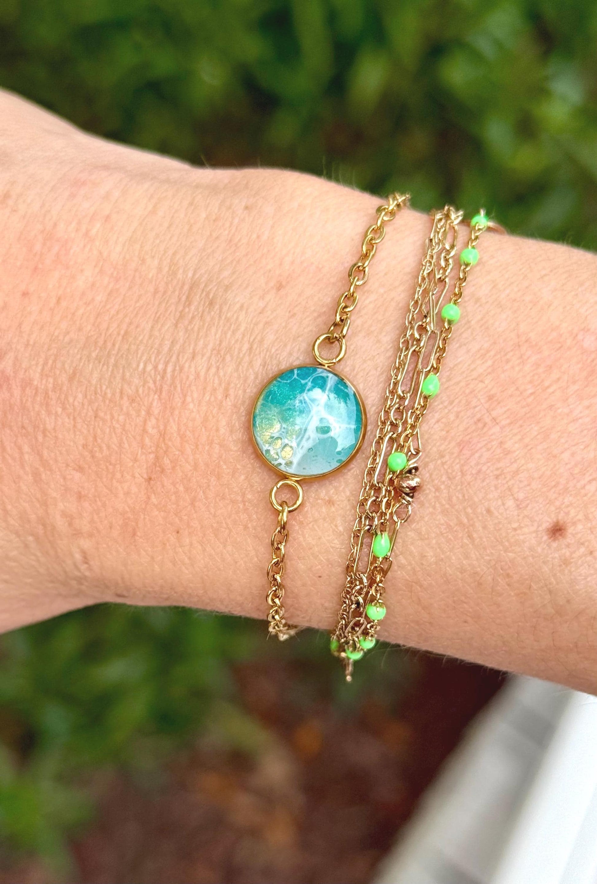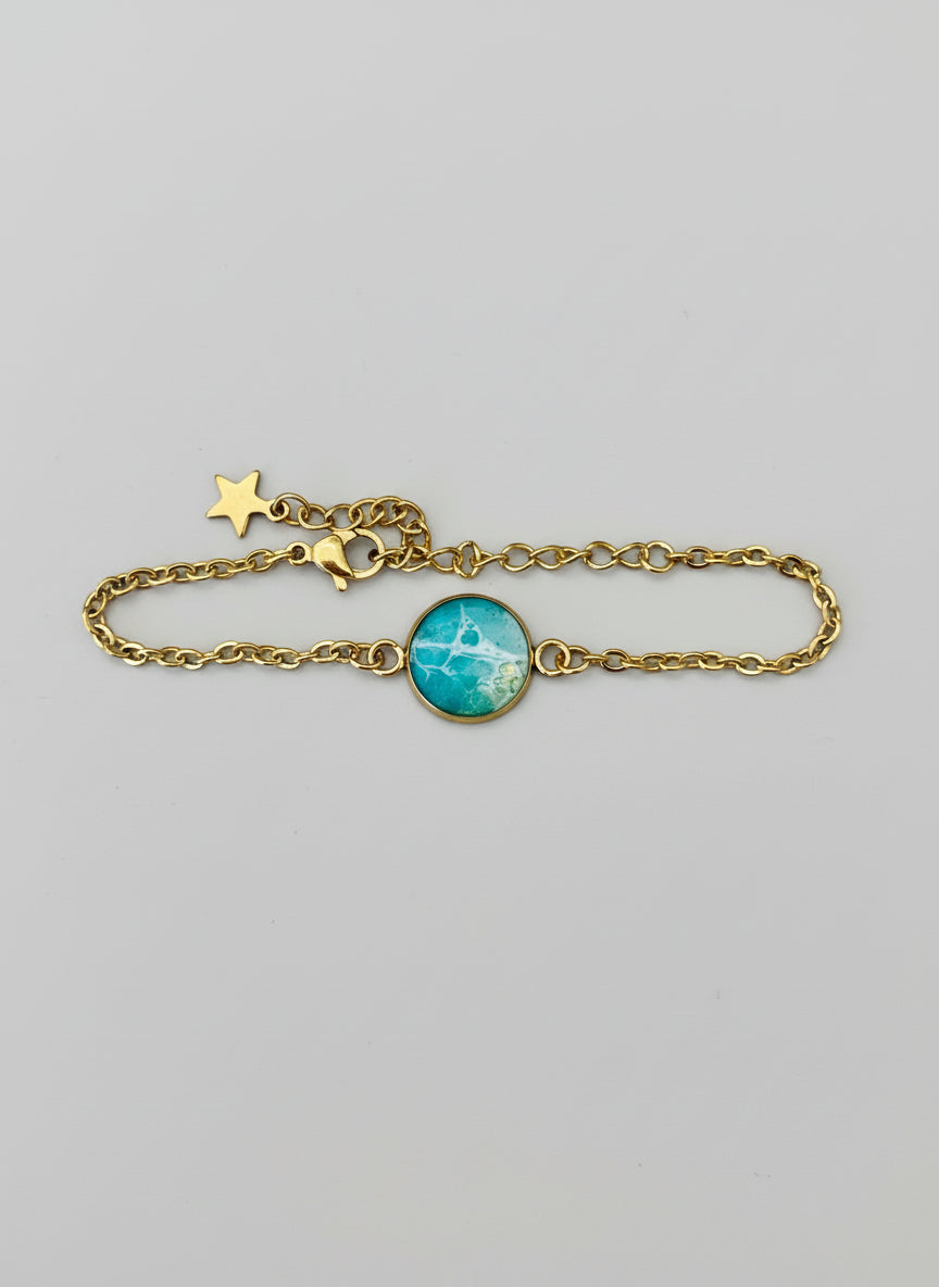 This stunning gold stainless steel chain bracelet is the perfect blend of elegance and style. Featuring a 12mm bezel filled with teal-colored resin, this bracelet makes a bold statement while offering a touch of sophistication.