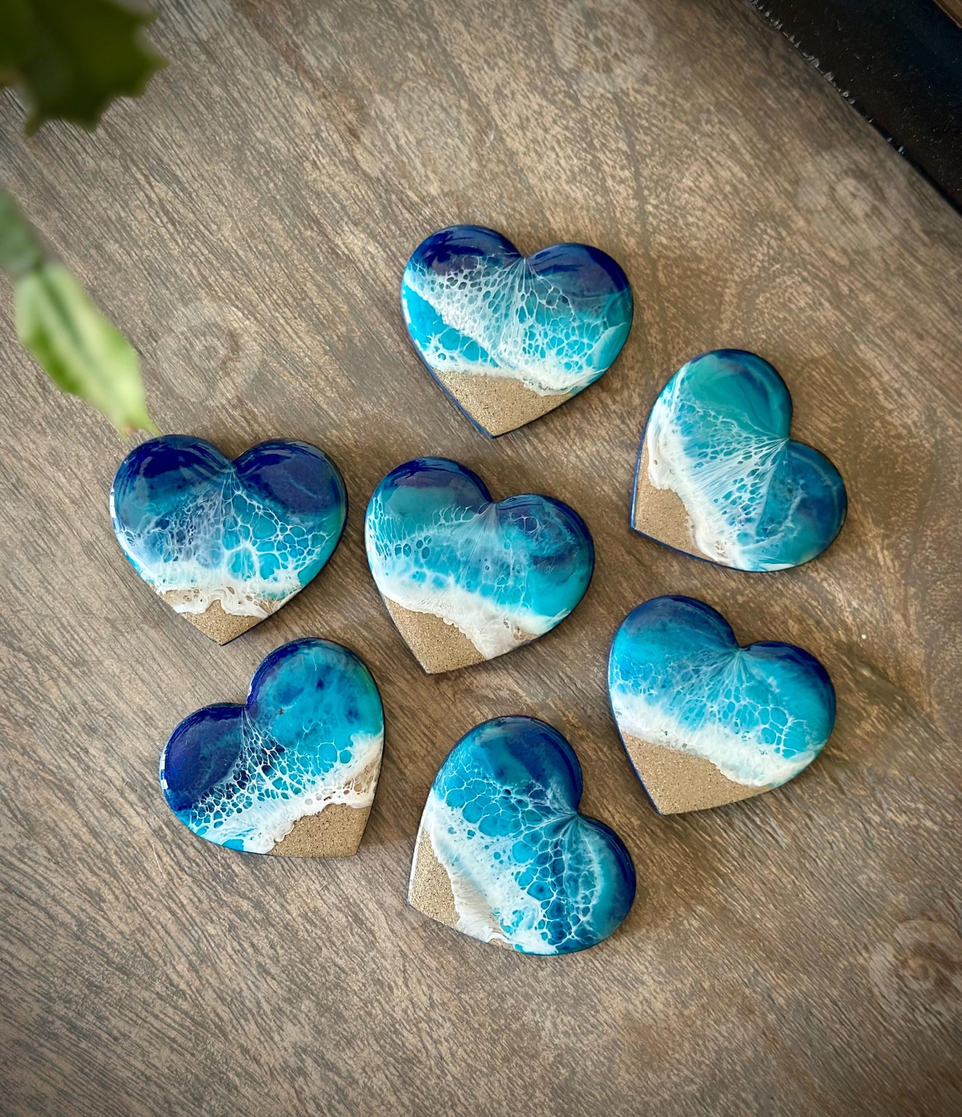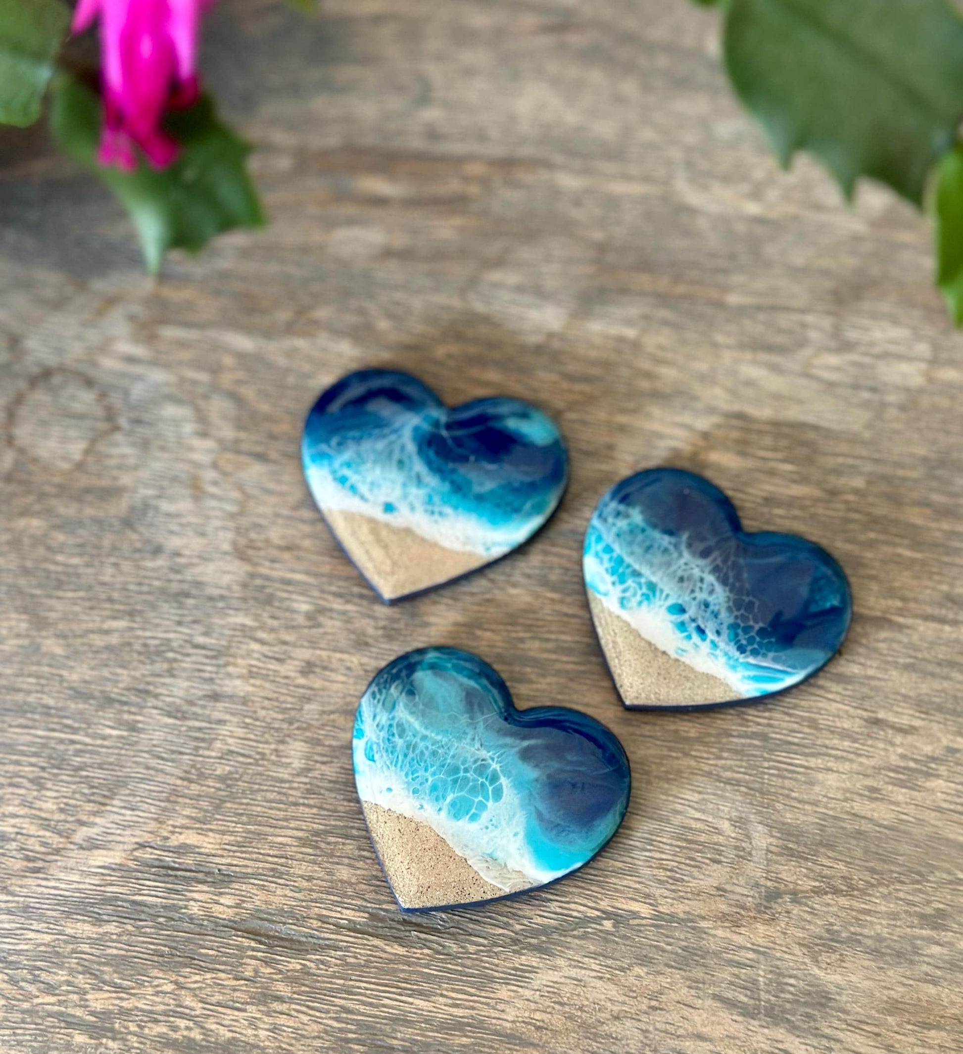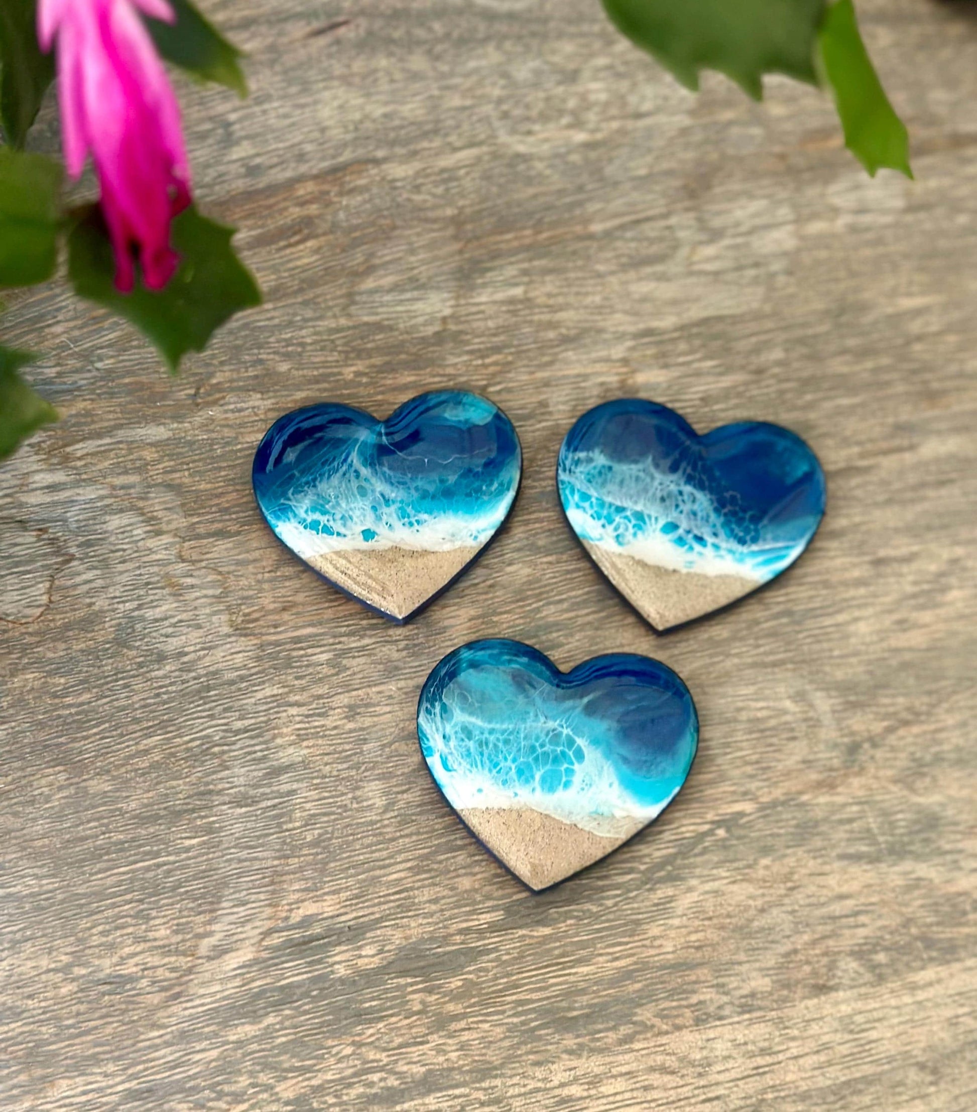 Each 1.5 inch wooden heart is covered in multiple layers of epoxy resin to create an ocean scene. The back of the magnet is painted blue.