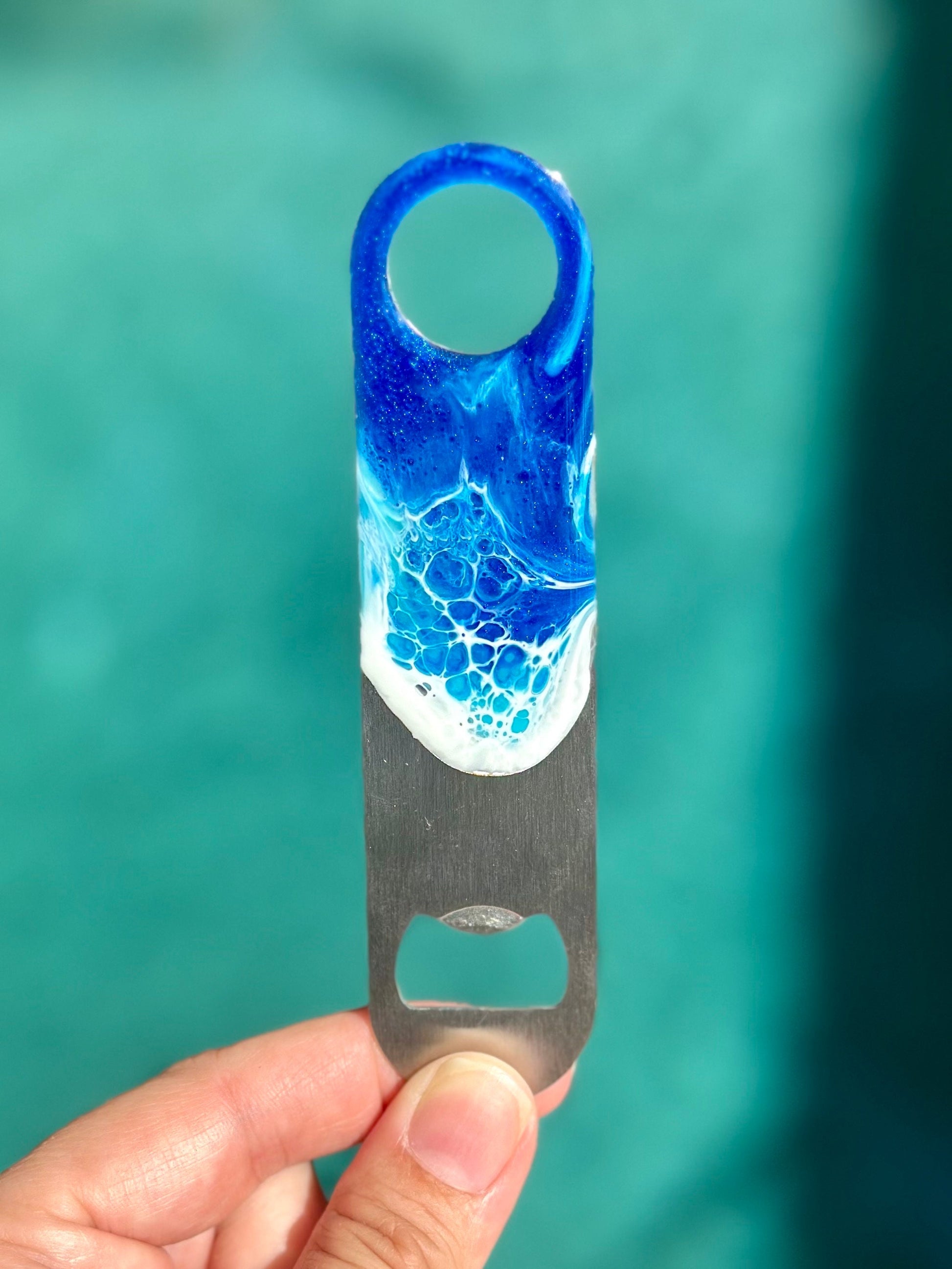 Welcome to our coastal-inspired stainless steel bottle opener featuring mesmerizing resin waves! 🌊