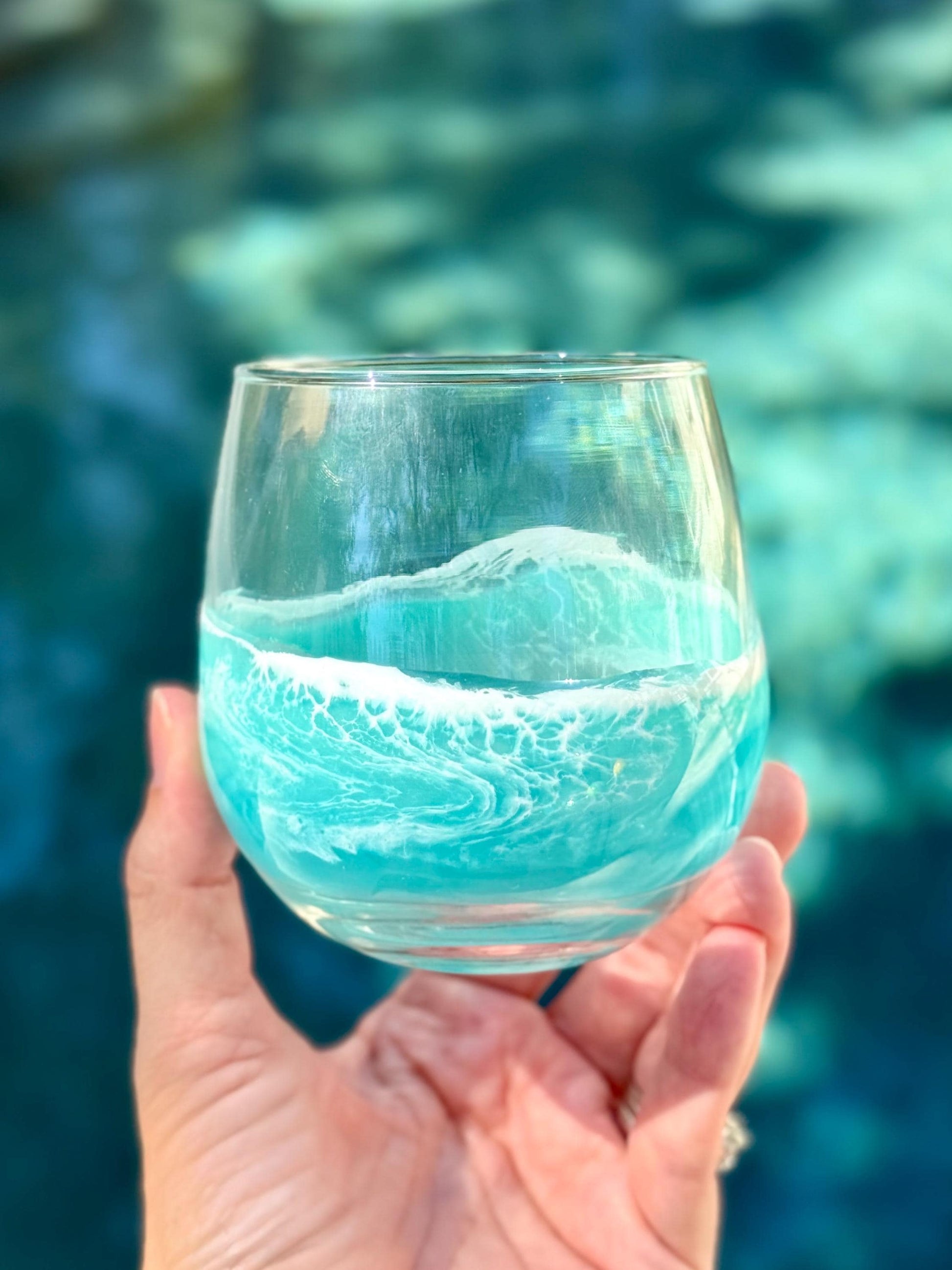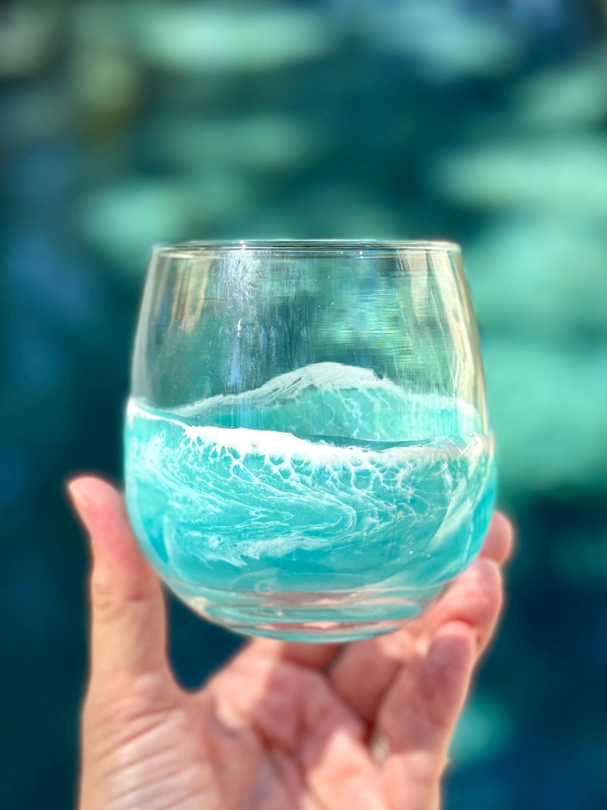 Bring coastal charm to your table with this 16.75 oz red wine glass featuring hand-poured teal resin waves along the base. Each glass is uniquely crafted, making it a perfect gift for beach lovers, coastal weddings, or ocean-inspired home décor. Ideal for sipping your favorite red wine, this ocean wave wine glass combines elegance with a touch of seaside artistry.