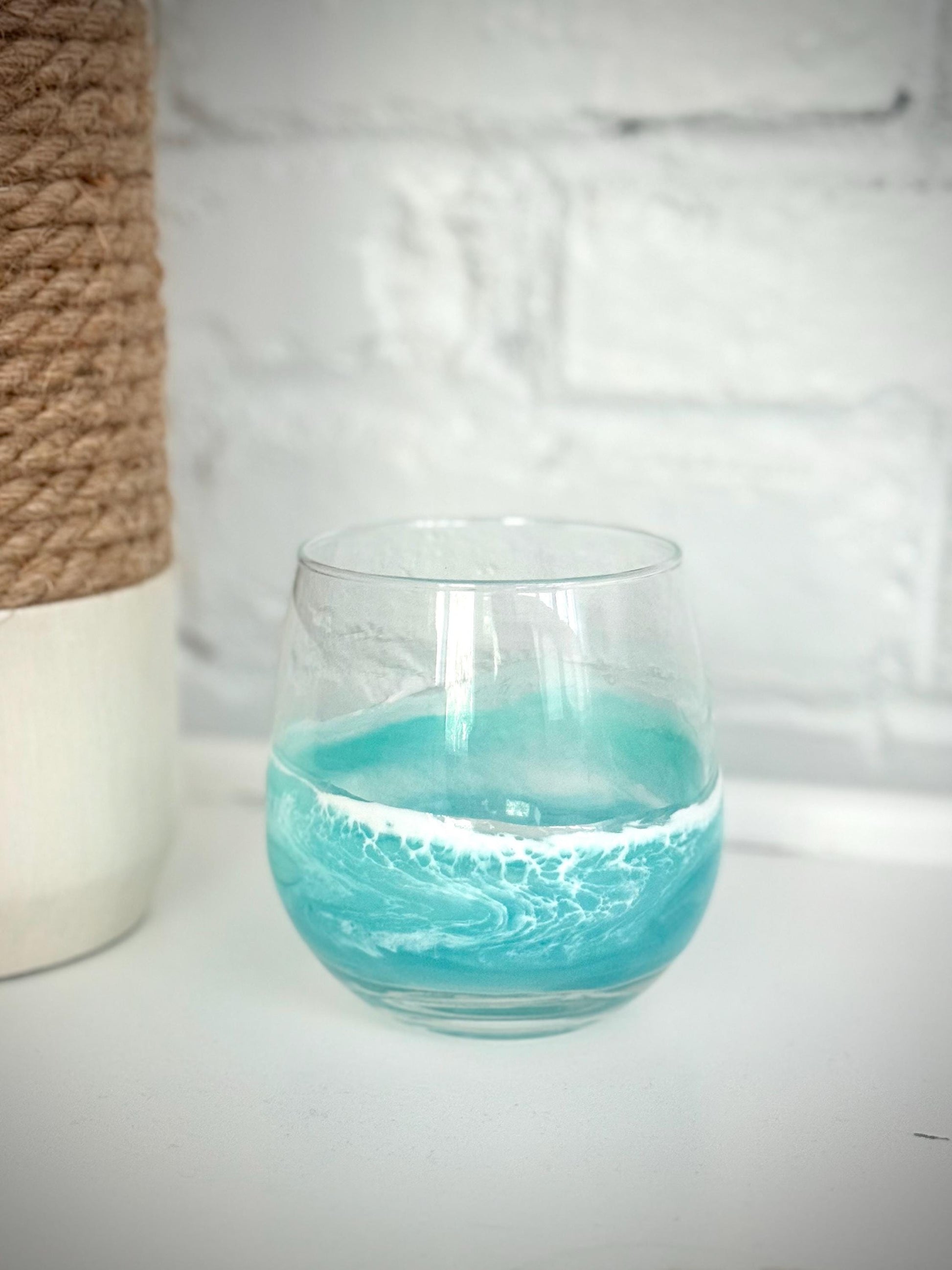 Teal Resin Wave Stemless Red Wine Glass: Coastal Beach House Drinkware - Teal Glassware